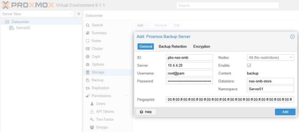 proxmox-backup-client namespace create Server02 --repository root@pam@localhost:nas-smb-storeCode-Sprache: PHP (php)