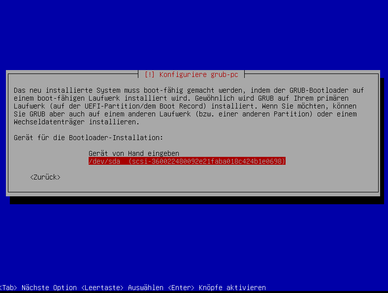 Select the corresponding disk for the GRUB boot loader installation.
