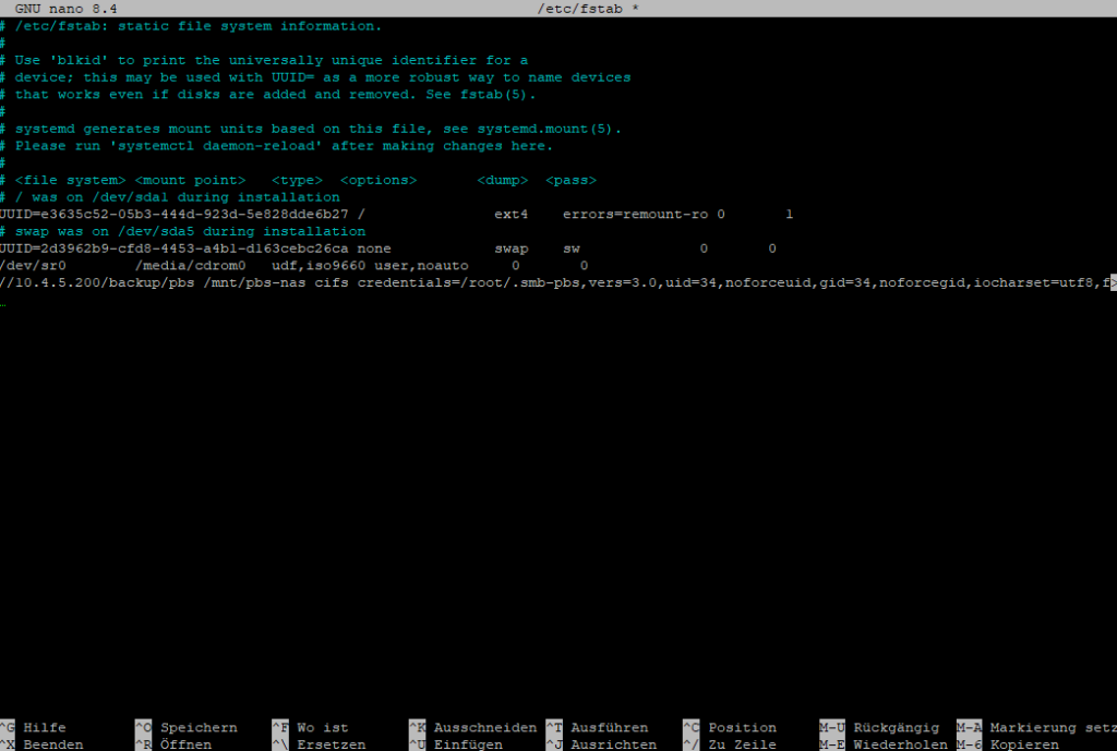 //10.4.5.200/backup/pbs /mnt/pbs-nas cifs credentials=/root/.smb-pbs,vers=3.0,uid=34,noforceuid,gid=34,noforcegid,iocharset=utf8,file_mode=0660,dir_mode=0770,_netdev,x-systemd.automount,nofail 0 0Code-Sprache: JSON / JSON mit Kommentaren (json)